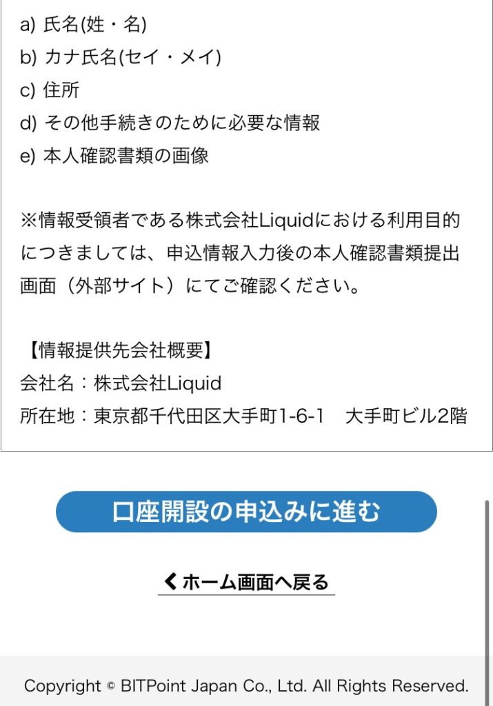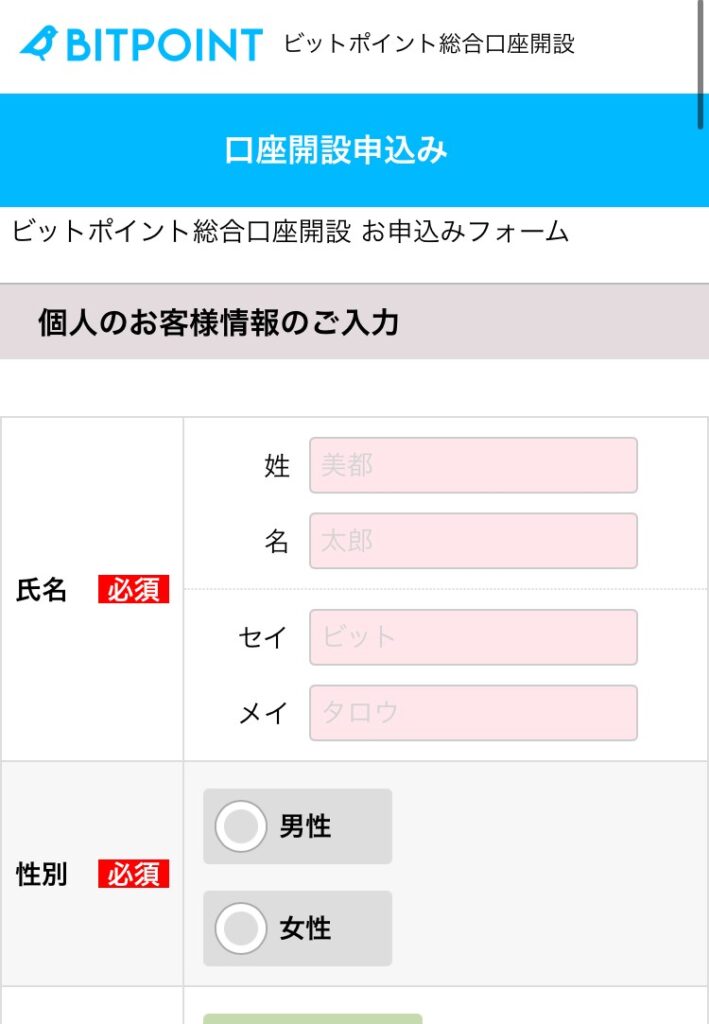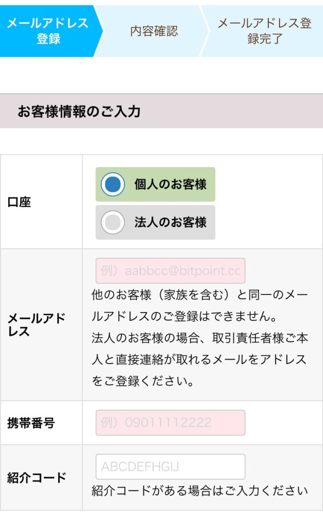 まずはBITPOINTの公式サイトから新規口座開設を行います。メールアドレスとパスワードを登録し、基本情報を入力するだけで数分で申し込みが完了します。