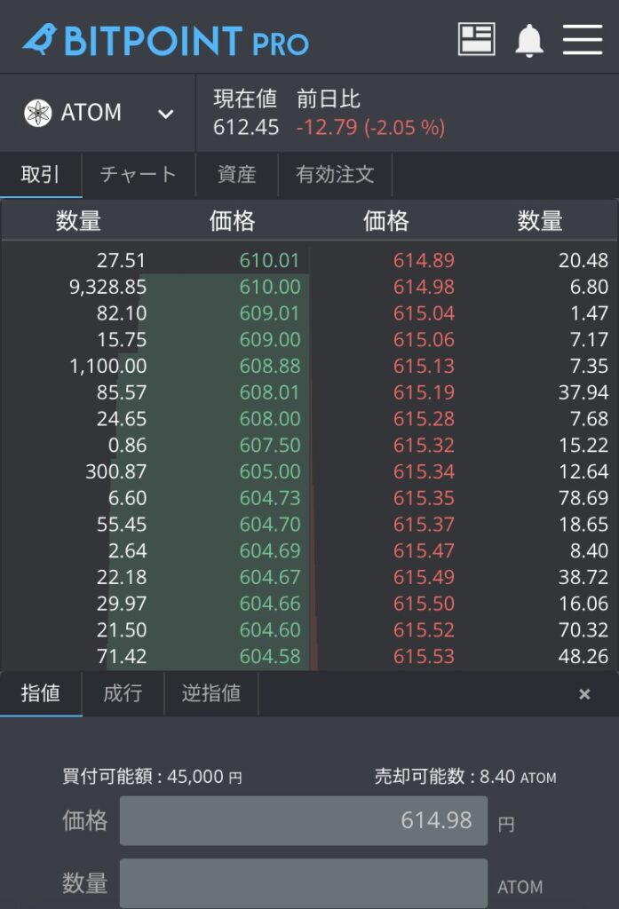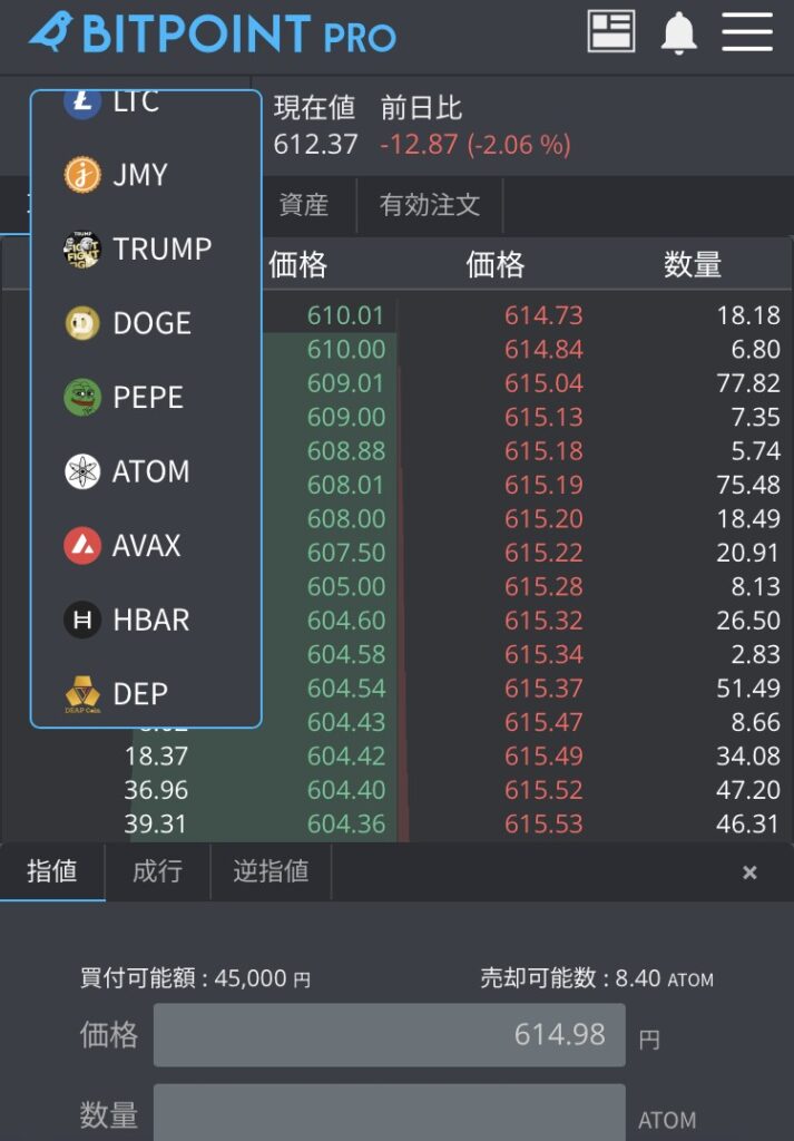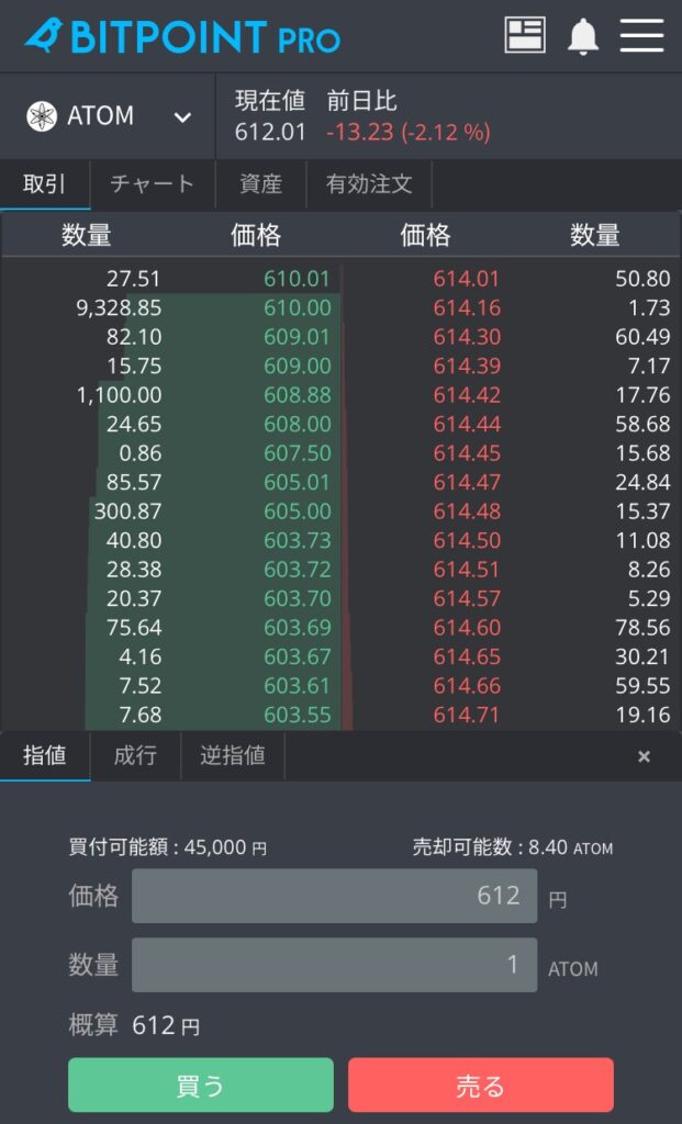 BITPOINT PROだと612円でしたが、販売所だと640円です