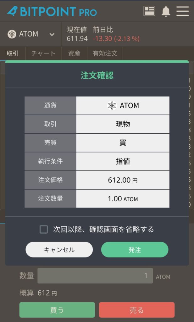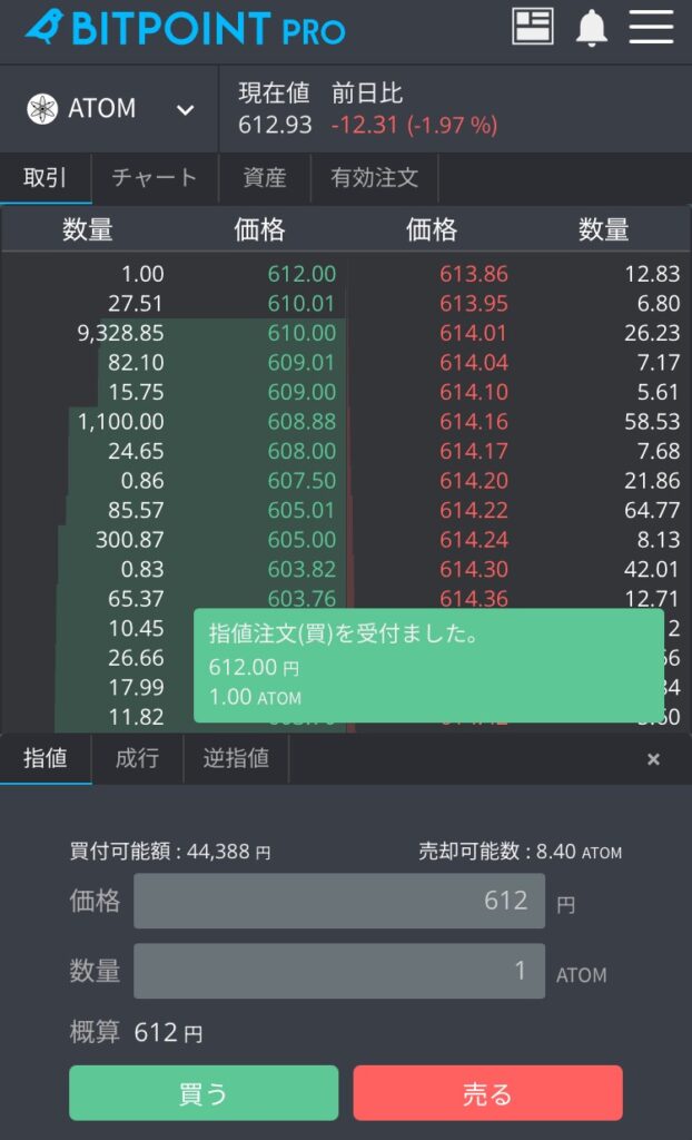 BITPOINTアプリを開き、「販売所」からATOMを選択して購入金額を入力するだけ。初心者でも迷わずに操作できます。取引手数料は無料です!