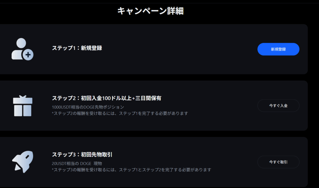 新規ユーザーなら、すべてクリアすることで 最大1,020USDT(約15万円) 相当の特典を受け取ることが可能です。