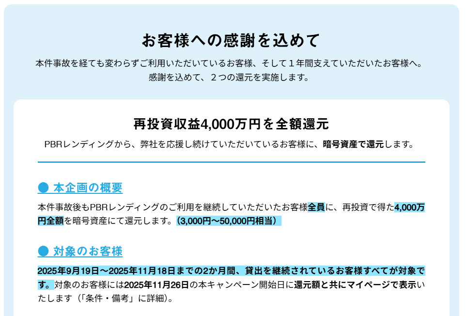 その①:2025年9月19日~2025年11月18日までの2か月間、貸出を継続されているお客様へ4,000万円全額還元