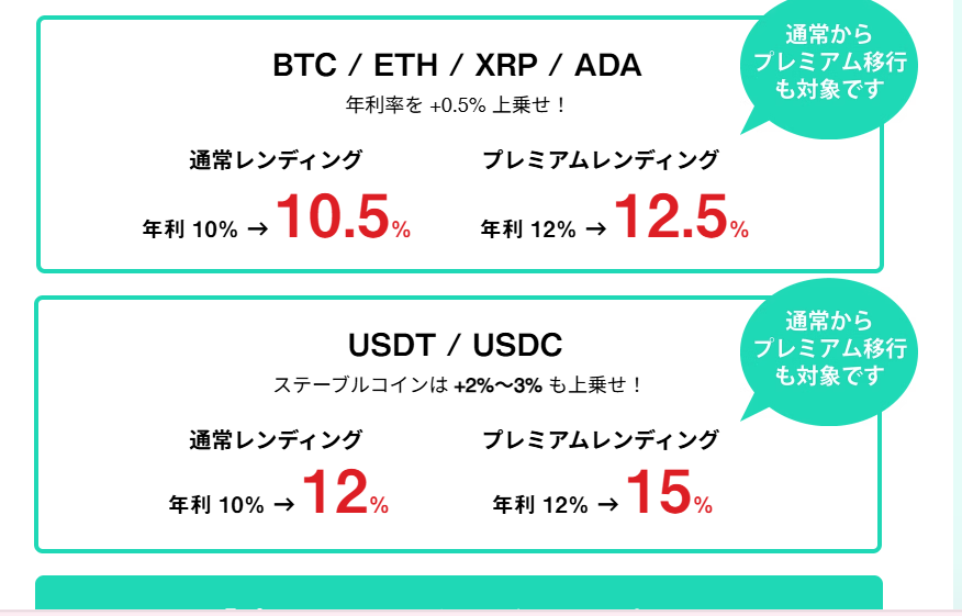| 向いている人 | 仮想通貨レンディング初心者 / 少額で試したい人 / 30日~の中期運用がメインの人 | 長期保有を前提にしている人 / 高利率を重視したい人 / 100万円以上を運用する予定の人 |
