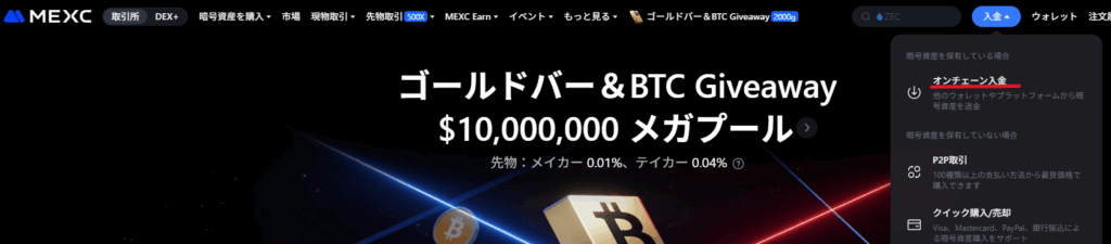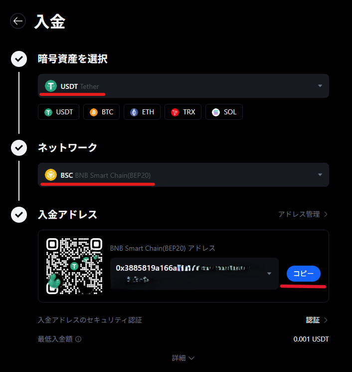 先ほどおすすめの運用方法でMEXCを紹介しましたが、USDTの国内取引所の取扱いはないので、返還先のMEXCのアドレス宛に送付するやり方を紹介します。