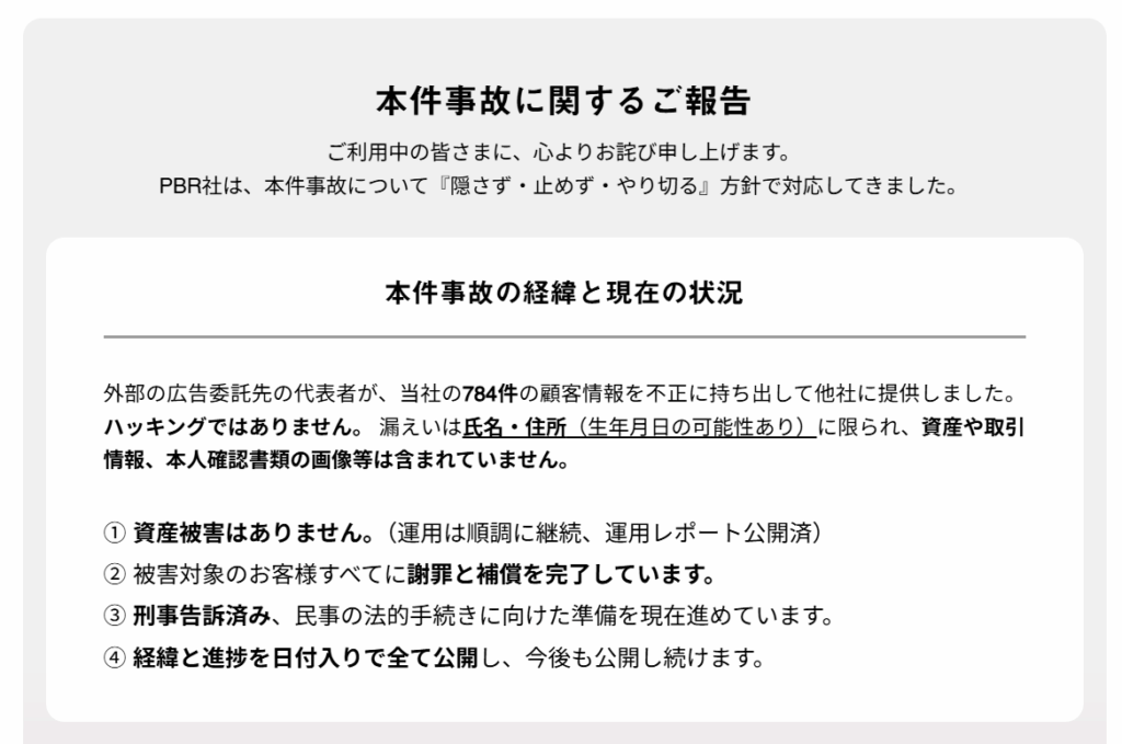 詳細:PBRレンディング|情報漏えい事故について — 現状・対応・今後の取り組み
