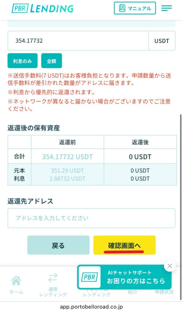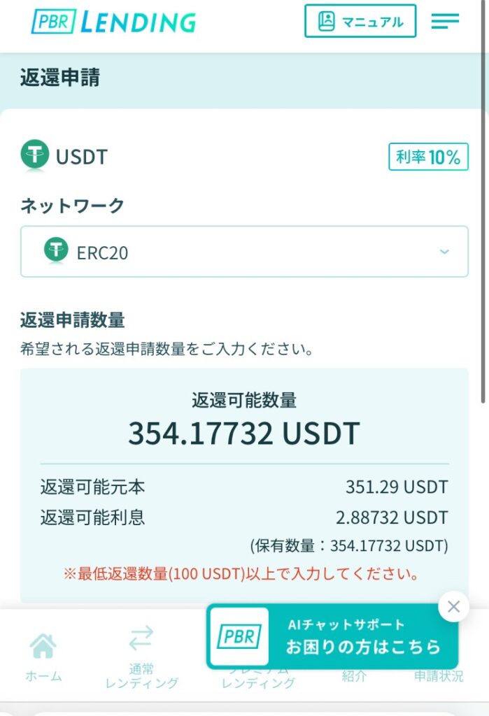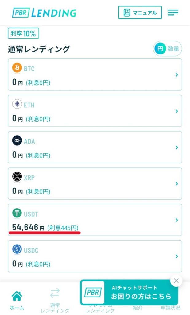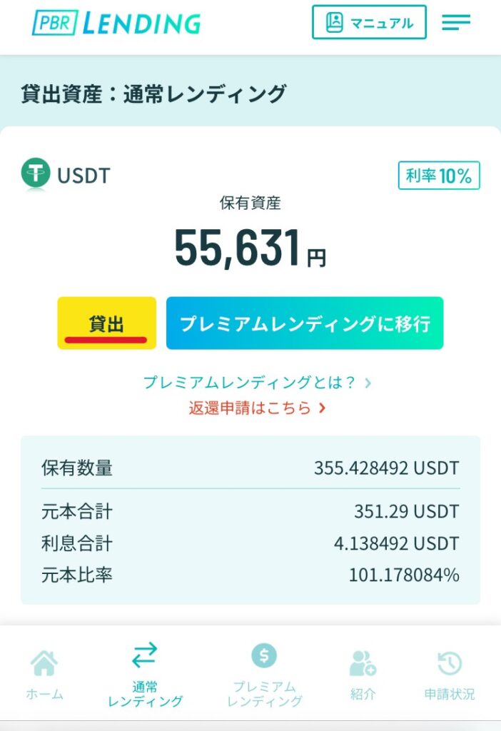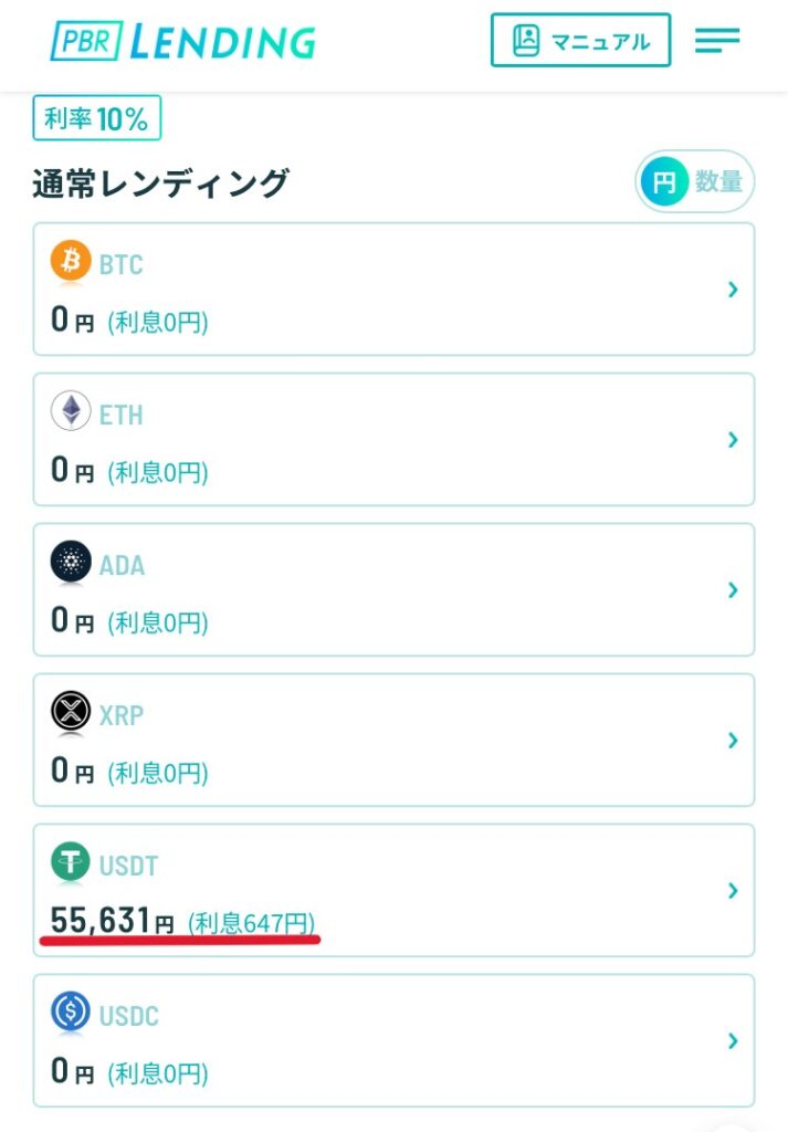 この画面は現在USDTをレンディングしているので、金額が表示されています。