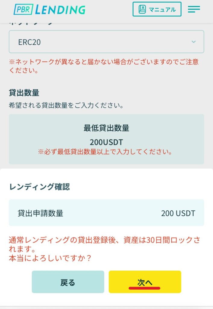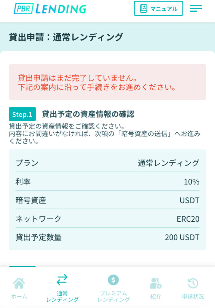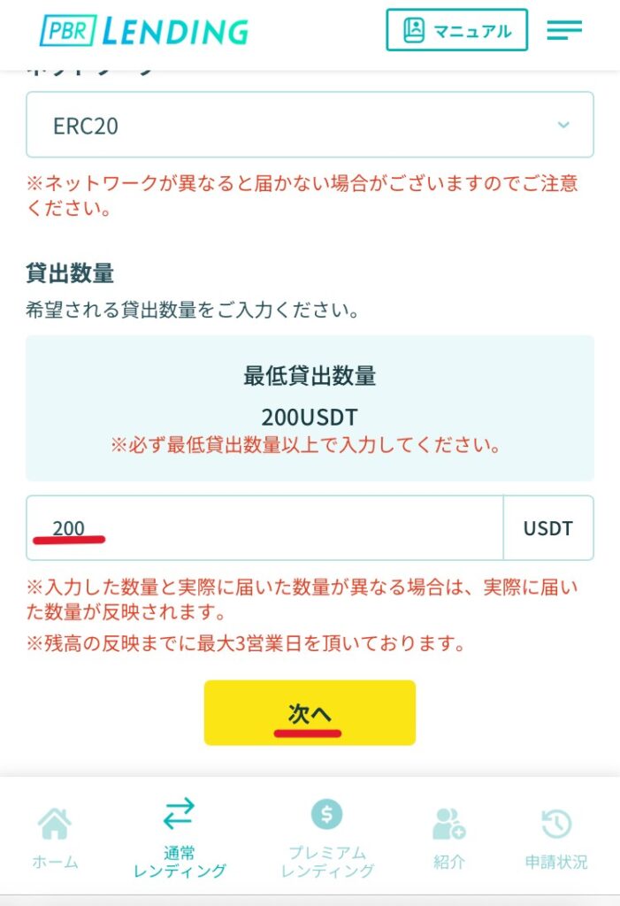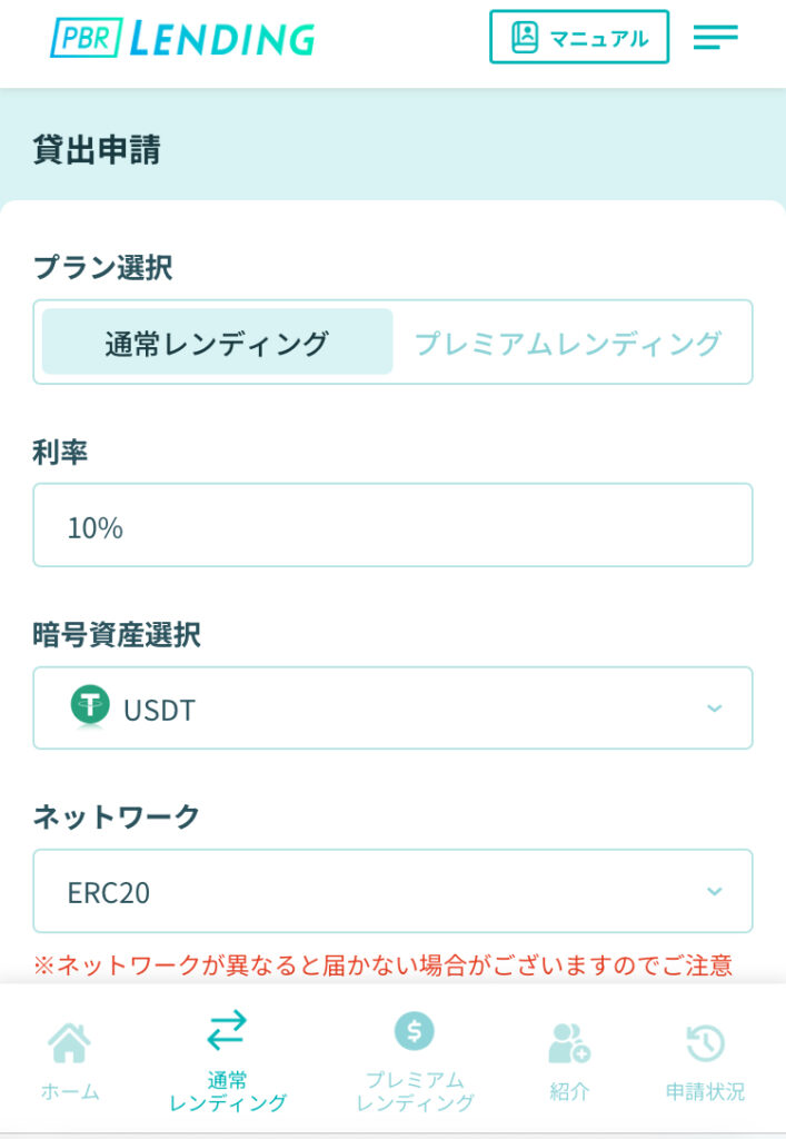 PBRLENDINGへ送金が完了したら、PBRLENDING側で貸出する通貨・数量・プランを選び、申請します。
