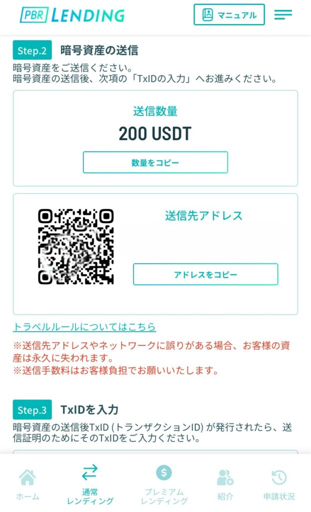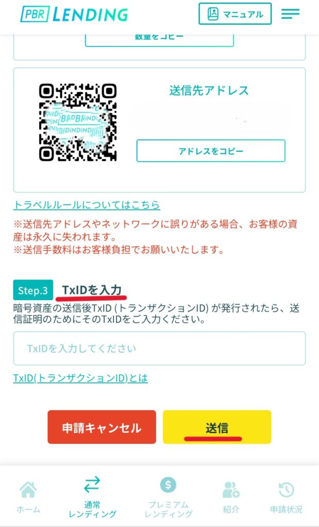 TxIDの入力が求められます。先ほど仮想通貨を送付した際に取引履歴から表示されたものを入力して、送信をタップすると貸出完了です。